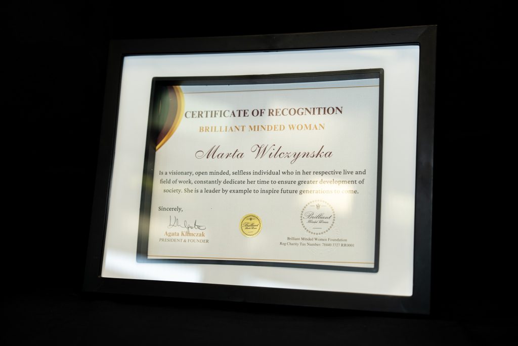 Formal recognition for Marta Wilczynska by the Government of Poland for outstanding contribution to women’s empowerment and excellence in self-development.
